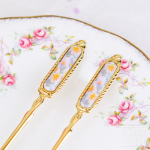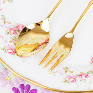Vintage inspired gold plated teaspoon and cake fork set with autumn leaves pattern, porcelain lozenge shaped tip to the handle.