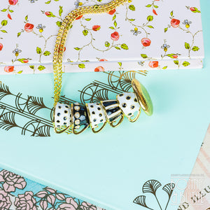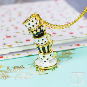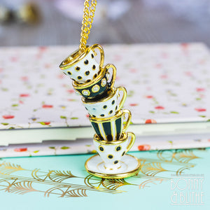 This jewellery is a tea lovers dream! A gorgeous stack of 5 miniature teacups in golden tones with black and white enamel dangle delightfully from a gold tone link chain. Each teacup, with its golden interior, can slide individually up and down the chain. The perfect gift for an afternoon tea lover. Presented in a velvet gift pouch.