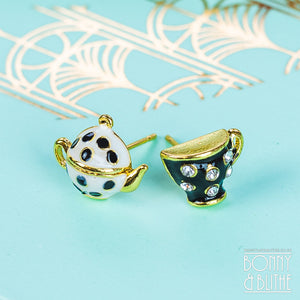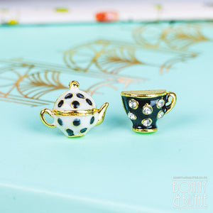 This jewellery is a tea lovers dream! A beautiful pair of gold tone stud earrings featuring a delightful miniature teapot and teacup design in black and white enamel. A lovely match to our teapot and teacup necklaces. The perfect gift for an afternoon tea lover. Presented in a velvet gift pouch.
