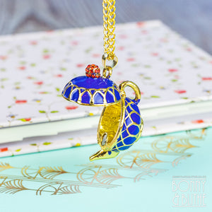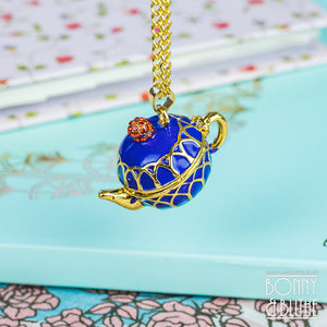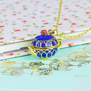This jewellery is a tea lovers dream! A beautiful miniature teapot pendant in golden tones with blue enamel decoration, adorned with a red jewel finial and hung from a gold tone link chain. This delightful teapot pendant opens up to display its golden interior. The perfect gift for an afternoon tea lover. Presented in a velvet gift pouch.