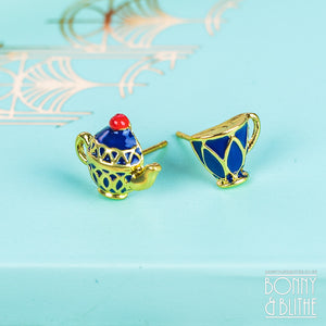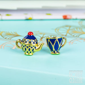 This jewellery is a tea lovers dream! A beautiful pair of gold tone stud earrings featuring a delightful miniature teapot and teacup design in blue enamel. A lovely match to our teapot and teacup necklaces. The perfect gift for an afternoon tea lover. Presented in a velvet gift pouch.