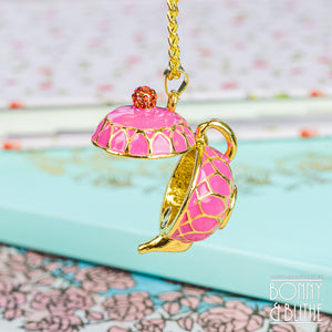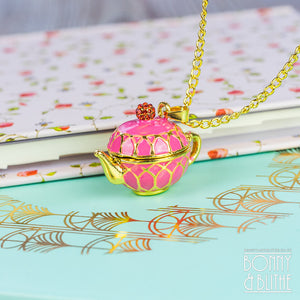 This jewellery is a tea lovers dream! A beautiful miniature teapot pendant in golden tones with pink enamel decoration, adorned with a red jewel finial and hung from a gold tone link chain. This delightful teapot pendant opens up to display its golden interior. The perfect gift for an afternoon tea lover. Presented in a velvet gift pouch.