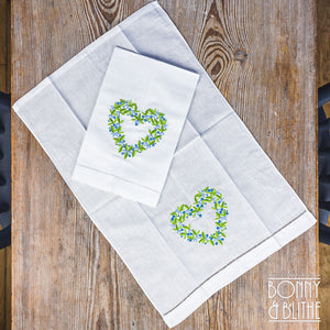 Pair of Embroidered Table Napkins | Blue Floral Heart Wreath