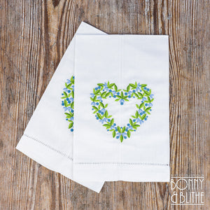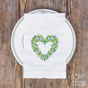 Add a touch of vintage glamour to your table with this beautiful pair of embroidered table napkins. A hemstitched cotton blend napkin, embroidered with a delightful heart shaped wreath of blue flowers accenting the green foliage.
