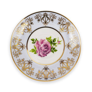 Inspired by the charming designs of the 1950s, the Bonny and Blithe exclusive Princess bone china teacup set features a pretty pink cabbage rose encircled by powder blue bands and trimmed with real gold details.