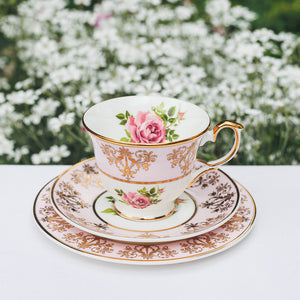 Inspired by the charming designs of the 1950s, the Bonny and Blithe exclusive Princess bone china teacup set features a pretty pink cabbage rose encircled by ballet pink bands and trimmed with real gold details.