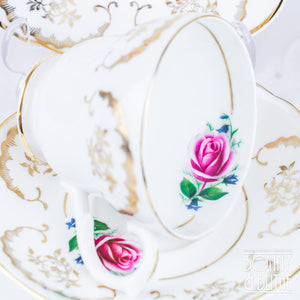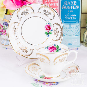 Vintage English bone china teacup, saucer and side plate with a pink rose and pretty gilded design.