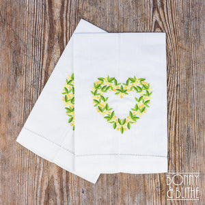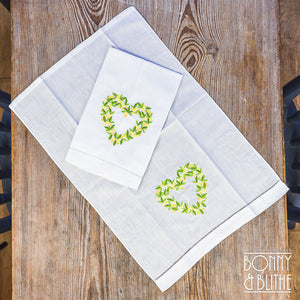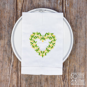 Add a touch of vintage glamour to your table with this beautiful pair of embroidered table napkins. A hemstitched cotton blend napkin, embroidered with a delightful heart shaped wreath of yellow flowers accenting the green foliage.