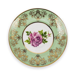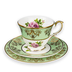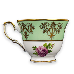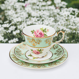 Inspired by the charming designs of the 1950s, the Bonny and Blithe exclusive Princess bone china teacup set features a pretty pink cabbage rose encircled by mint green bands and trimmed with real gold details.