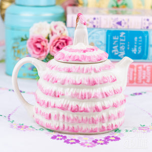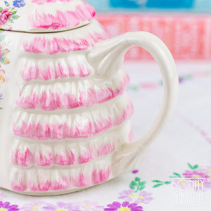 Vintage English earthen ware teapot by Sadler in the Crinoline Lady shape know as Ye Daintee Ladyee, which was first design for Queen Mary in the 1930s. It features hand painted pink frills and cintz floral spray.