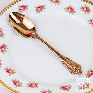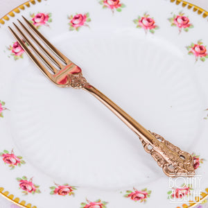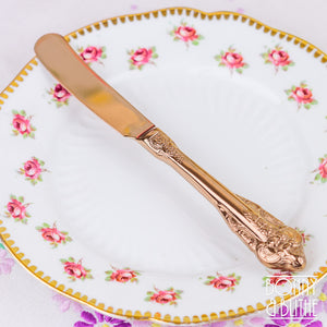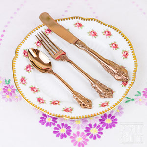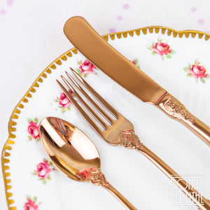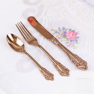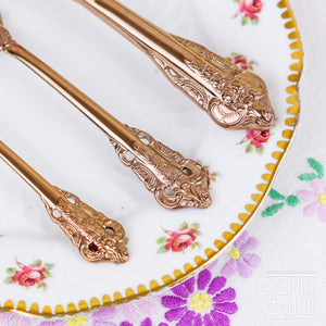 Vintage inspired rose gold tone 3 piece afternoon tea cutlery set with ornate handle detailing. The set includes: