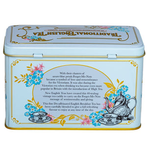 This Vintage Victorian style tea tin features a powder-blue finish, complete with Victorian era tea ware illustrations, gold trimming, embossing and azure blue Forget-Me-Not florals. Forget-Me-Nots became a symbol of love and remembrance for the Victorians and it was during this era that tea became more popular due to the introduction of high tea.