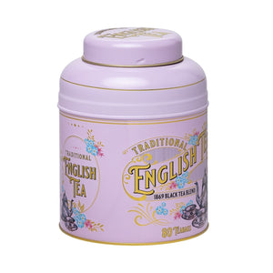 A rose-pink Vintage Victorian style round tea tin featuring Victorian tea ware illustrations, gold trimming, embossing and azure blue Forget-Me-Not florals. Forget-Me-Nots became a symbol of love and remembrance for the Victorians and it was during this era that tea became more popular due to the introduction of high tea.